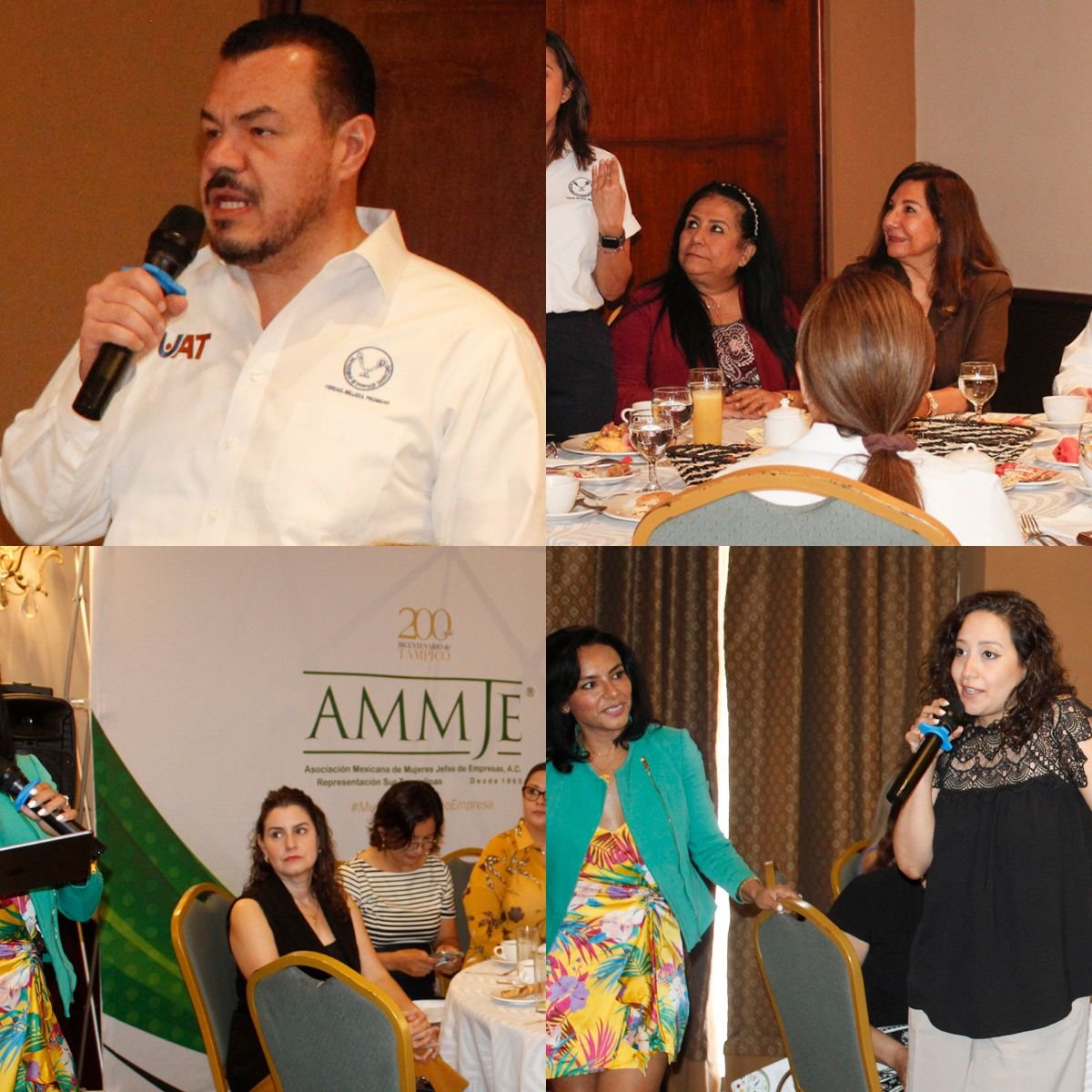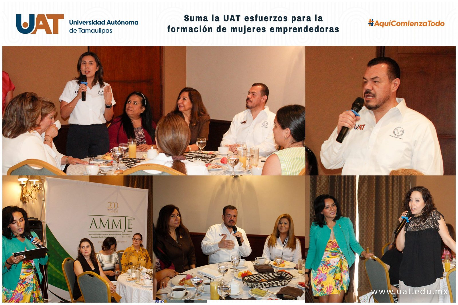 La reunión se dio en el marco de la Asamblea General de la Asociación Mexicana de Mujeres Jefas de Empresa, A. C. (AMMJE) y su representación en Tamaulipas, efectuada en un centro social de Tampico. En ese contexto, la C. P. Martha Eulalia Llanes López, presidenta de la AMMJE en Tamaulipas, agradeció al rector Guillermo Mendoza la participación de la UAT en los trabajos del organismo empresarial y respaldar con sus propuestas los objetivos de impulsar la formación de mujeres emprendedoras.