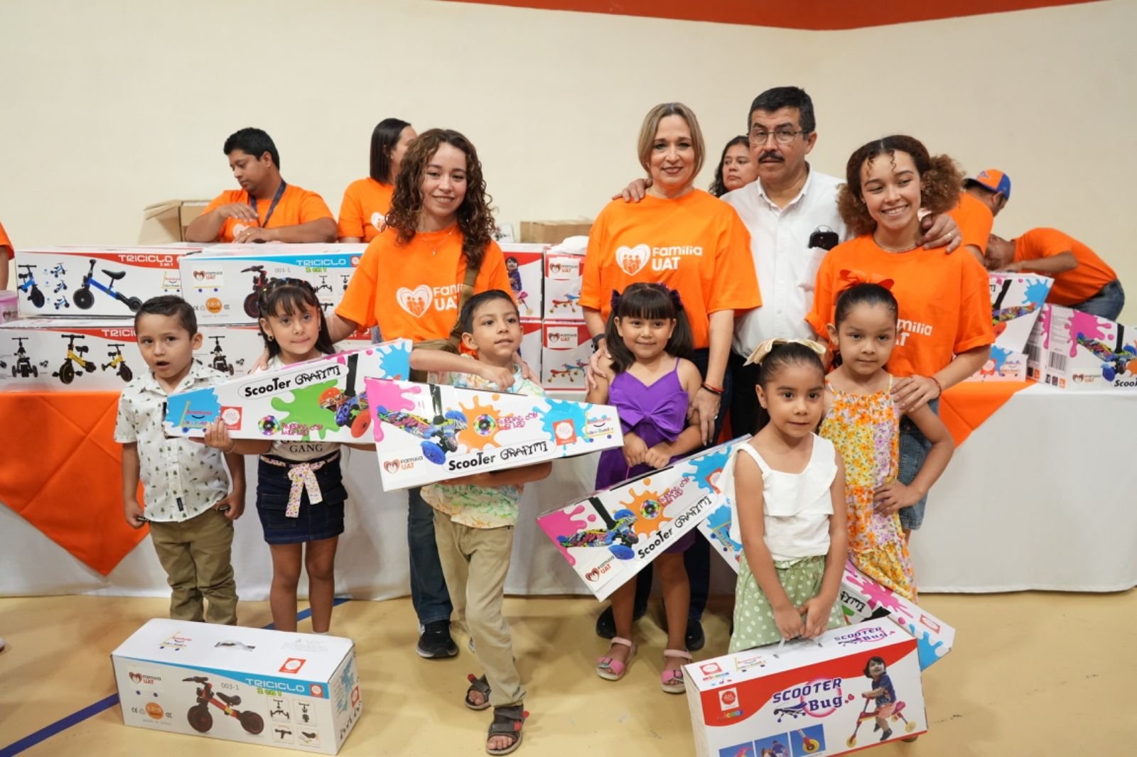 El rector de la Universidad Autónoma de Tamaulipas, MVZ Dámaso Leonardo Anaya Alvarado, y su esposa, Lic. Isolda Rendón de Anaya, pusieron en marcha los eventos del Día del Niño y de la Niña que la casa de estudios organiza para festejar a los hijos e hijas del personal universitario afiliado al Sindicato Único de Trabajadores de la UAT.