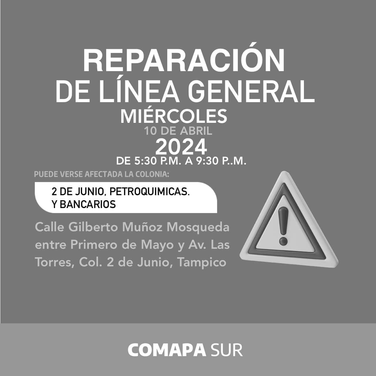 AVISO DE CORTE Suspensión de servicio de agua por trabajos de reparación de fuga de agua en línea general. Se restablecerá el servicio a partir de las 9:30 p.m. de hoy miércoles 10 de Abril de 2024. Pueden verse afectadas las colonias: 2 de Junio, Petroquimicas y Bancarios #Tampico#ComapaSur