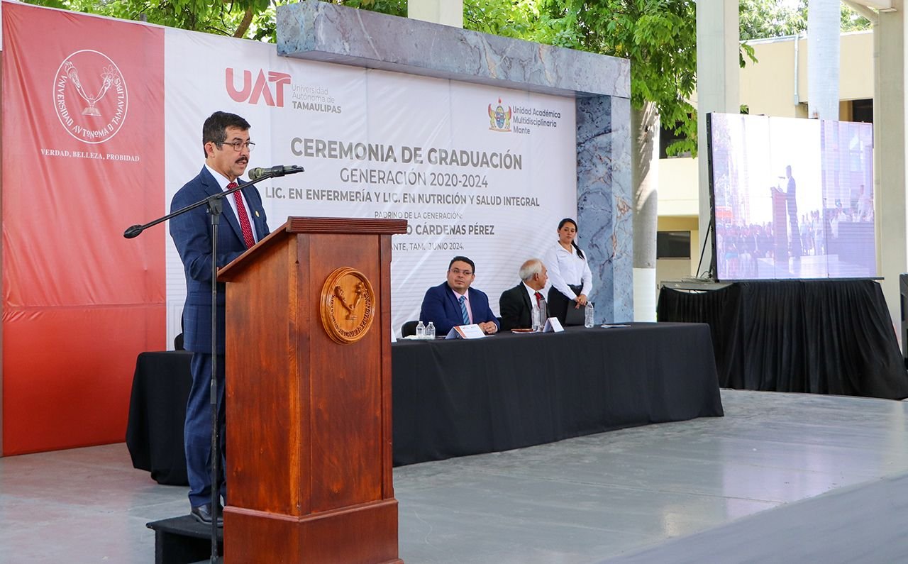 La generación 2020-2024 de las Licenciaturas en Enfermería y en Nutrición y Salud Integral de la Unidad Académica Multidisciplinaria Mante celebraron su ceremonia de graduación en un emotivo evento que presidió el rector de la Universidad Autónoma de Tamaulipas (UAT), MVZ Dámaso Anaya Alvarado.