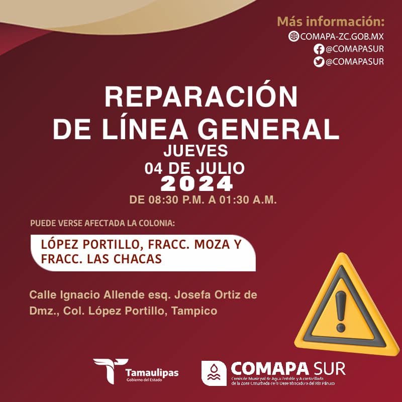 Pueden verse afectadas las colonias: López Portillo, Fracc. Moza y Fracc. Las Chacas #Tampico#ComapaSur