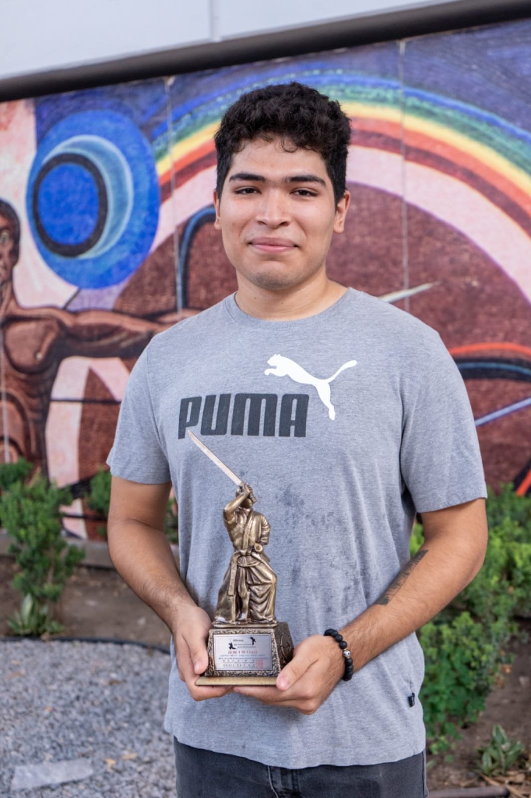 José Félix Rodríguez Ávalos, alumno de la Universidad Autónoma de Tamaulipas (UAT), compartió con el rector de la UAT, MVZ. Dámaso Leonardo Alvarado, el trofeo del primer lugar obtenido en el 13º Campeonato Mundial de Haidong Gumdo, realizado en la isla de Jeju, Corea del Sur.