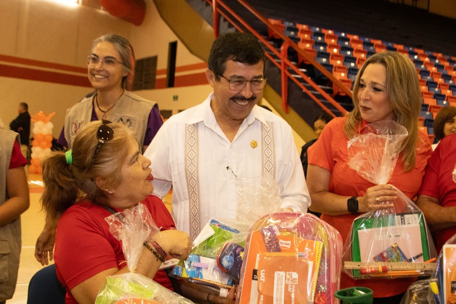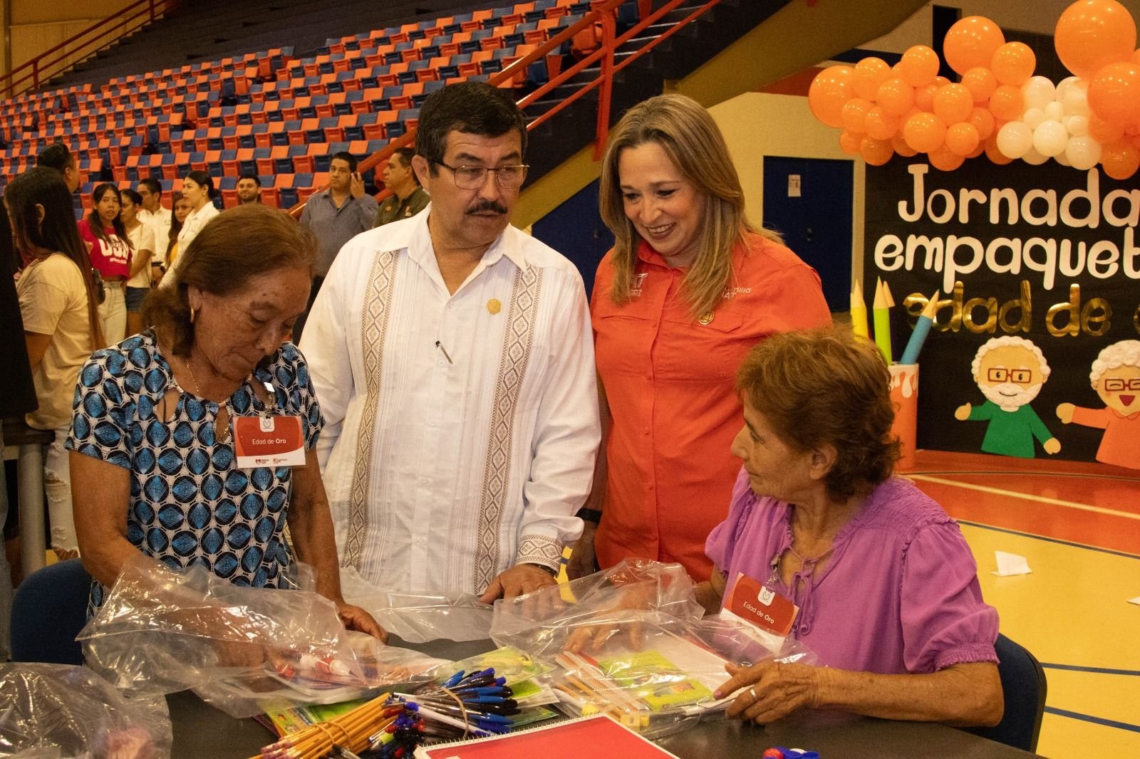 Con gran entusiasmo, los abuelitos del club del adulto mayor del COMASS-UAT convivieron en esta dinámica y compartieron con el rector Dámaso Anaya y su esposa Isolda Rendón esta jornada de empaquetado de útiles escolares recolectados, como cuadernos, lápices de grafito, lápices de colores, plumas, marcatextos, tijeras, estuches de geometría, pegamentos, borradores, sacapuntas, loncheras, mochilas y lapiceras.