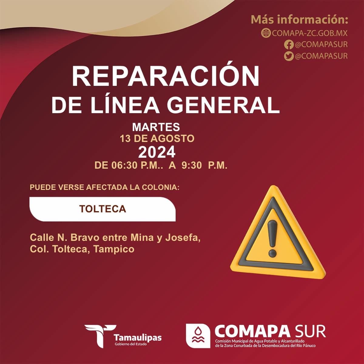 AVISO DE CORTE Suspensión de servicio de agua por trabajos de reparación de fuga de agua en línea general. Se restablecerá el servicio a partir de las 9:30 p.m. de hoy martes 13 de Agosto de 2024 Puede verse afectada la colonia: Tolteca #Tampico#ComapaSur