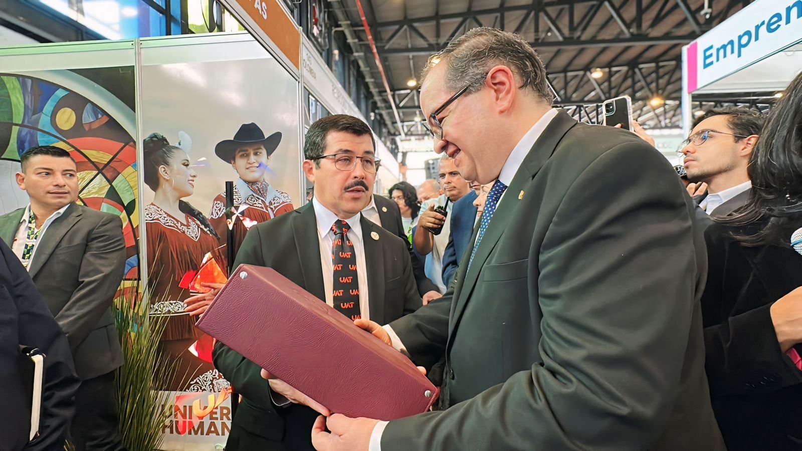Durante la ceremonia inaugural, el rector Dámaso Anaya recibió en el módulo de la UAT a distinguidas personalidades académicas; entre otros, a su homólogo, el Dr. Leonardo Lomelí Vanegas; al rector de la Universidad de la República de Uruguay (UDELAR), Prof. Rodrigo Arím; y a la coordinadora de Difusión Cultural de la UNAM, Dra. Rosa Beltrán Álvarez.