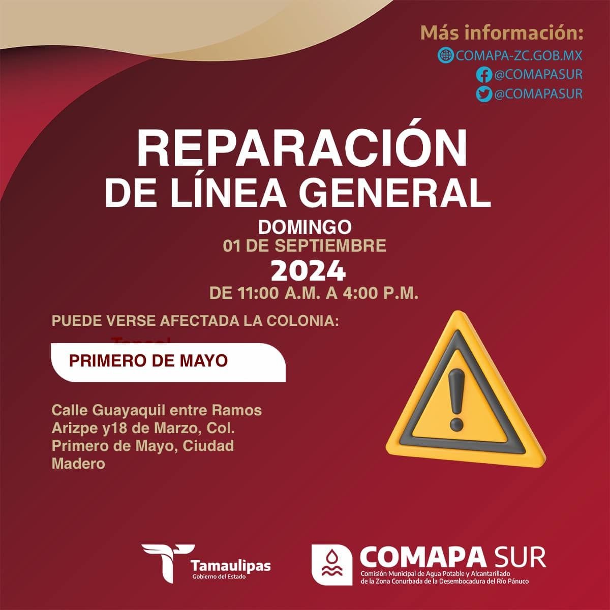 AVISO DE CORTE Suspensión de servicio de agua por trabajos de reparación de línea general. Se restablecerá el servicio a partir de la 4:00 p.m. de hoy domingo 01 de Septiembre de 2024 Puede verse afectada la colonia: Primero de Mayo #CdMadero#ComapaSur