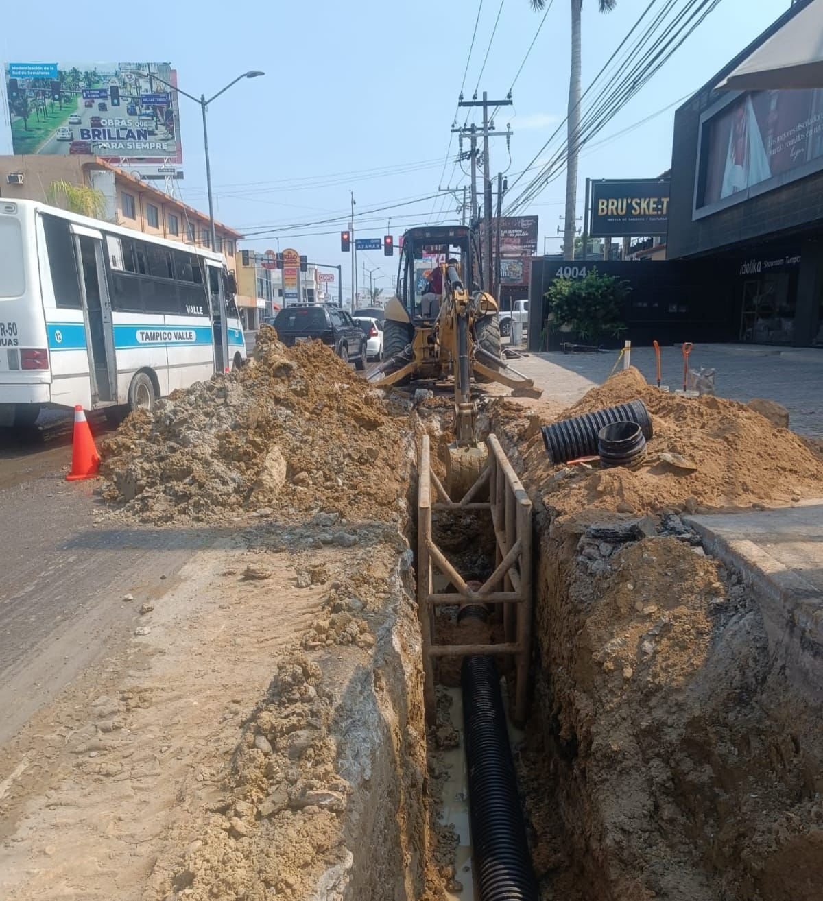 Los trabajos se ejecutan en la citada vialidad, en el tramo comprendido entre las calles Río Guayalejo y Azahar de la colonia Sierra Morena, en donde se lleva a cabo la reposición de alrededor de 120 metros lineales de tubería de 12 pulgadas de diámetro, con lo que se beneficiará este sector comercial de la ciudad.