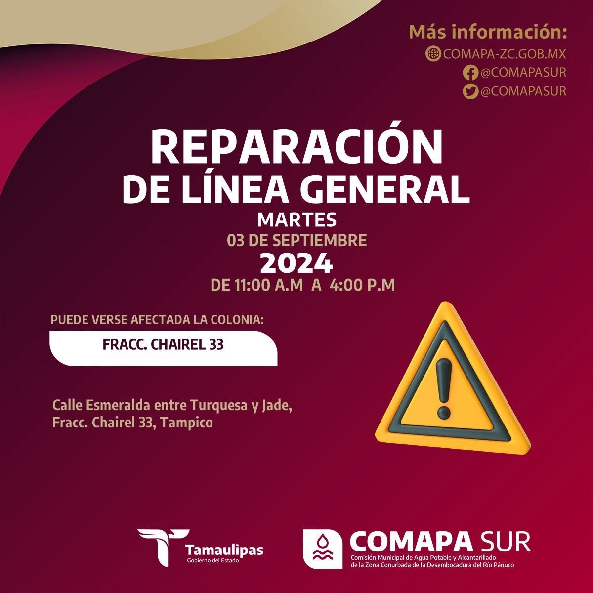 AVISO DE CORTE Suspensión de servicio de agua por trabajos de reparación de línea general. Se restablecerá el servicio a partir de la 4:00 p.m. de hoy martes 03 de Septiembre de 2024 Puede verse afectada la colonia: Fracc. Chairel 33 #Tampico#ComapaSur