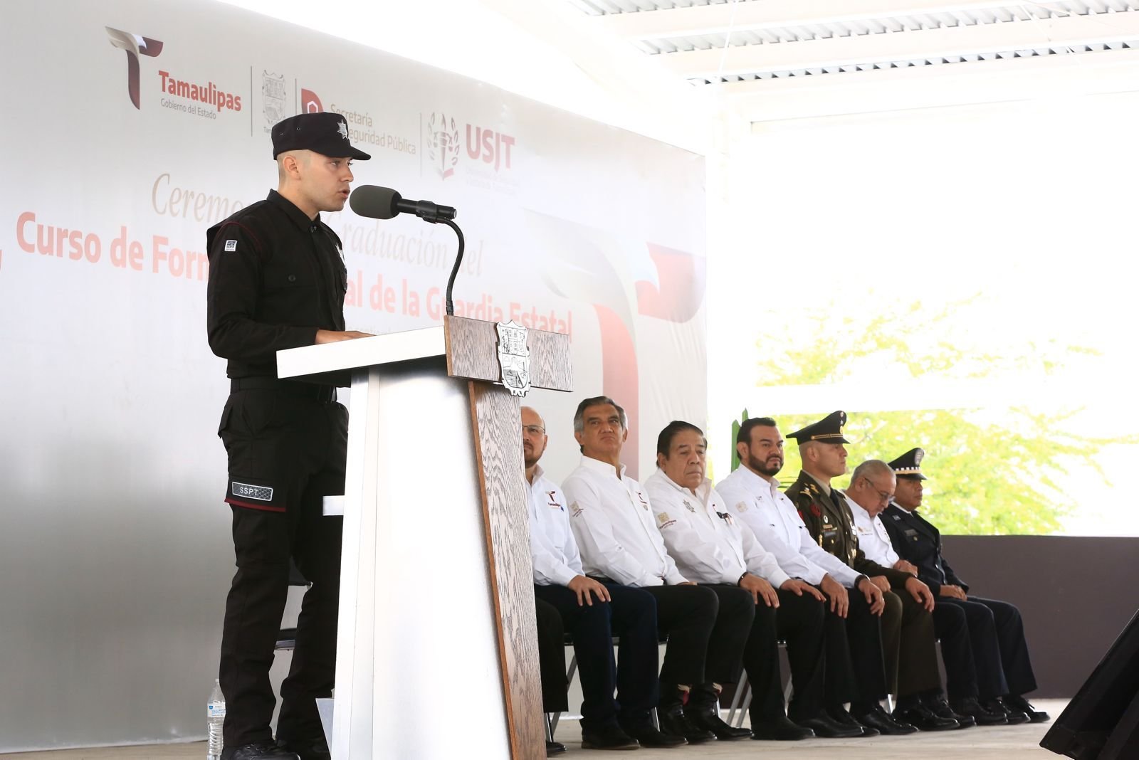 A nombre de los nuevos integrantes de la Guardia Estatal, Cristian Misael Guarneros Alonso aseguró que la enseñanza y los conocimientos adquiridos en la Universidad de Seguridad y Justicia los pondrán al servicio de las y los tamaulipecos para contribuir a preservar la seguridad la paz y bienestar en nuestro estado.