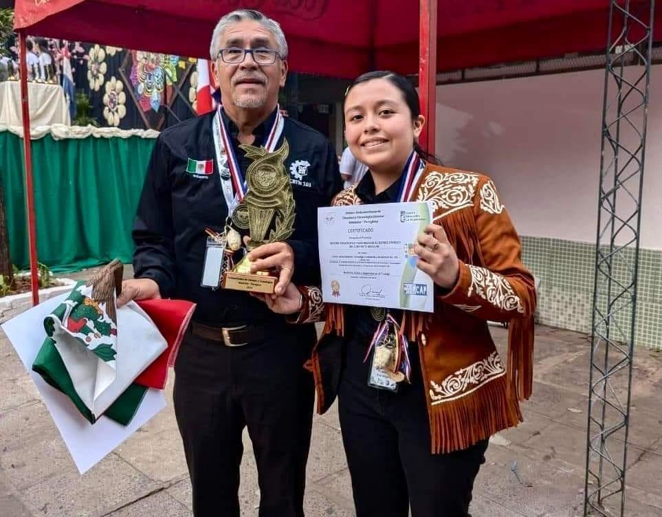 Alumna Belehem Sanchez Santiago Y su asesor LIC. Ursino Cervantes Vazquez del CBTIS No. 103 en Tamaulipas, quien además de contar con un promedio de excelencia, hace unos días obtuvo el #PrimerLugar en la categoría de Medicina, Salud y Seguridad del Primer Concurso Sudamericano de Ciencias y Tecnologías Internacionales Escolares, llevado a principios de septiembre del 2024 en Asunción, Paraguay.
