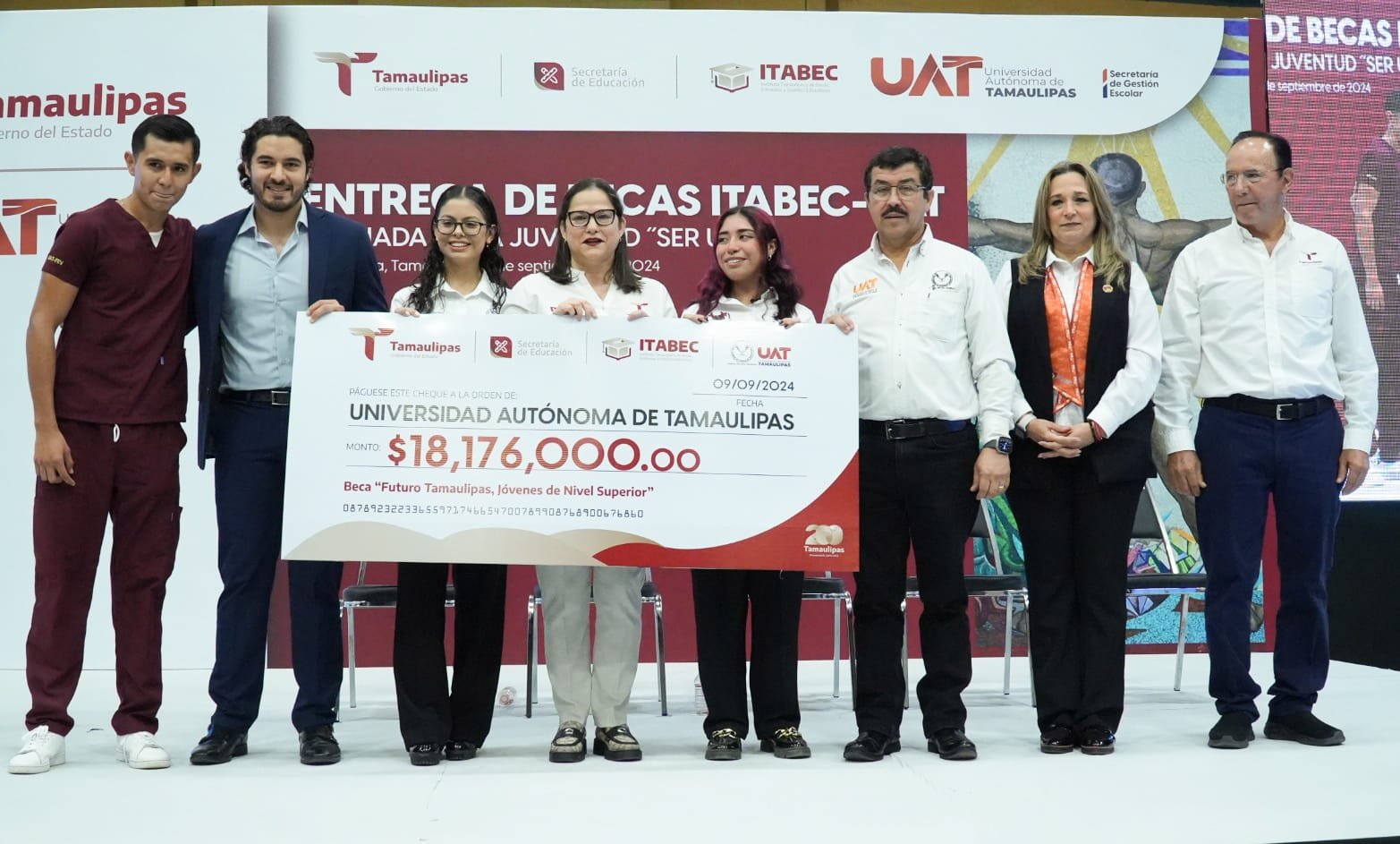 En reconocimiento a su esfuerzo académico, más de nueve mil estudiantes de la Universidad Autónoma de Tamaulipas recibieron la beca ITABEC-UAT “Futuro Tamaulipas, Jóvenes de Nivel Superior” en una ceremonia que encabezó el rector de la máxima casa de estudios de la entidad, MVZ Dámaso Anaya Alvarado.