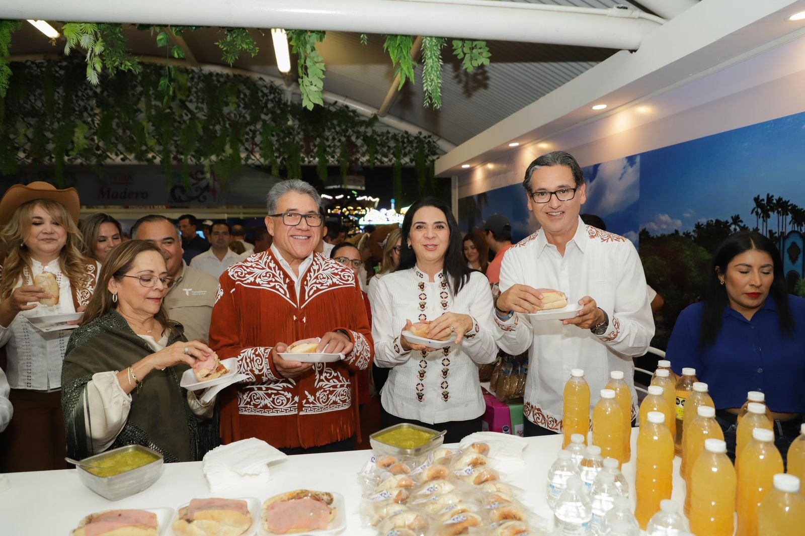 Mónica Villarreal, acompañada de la Directora de Desarrollo Económico, Nora Alejandra Izaguirre Acevedo y miembros del Cabildo, detalló que el stand porteño ofrece también una muestra gastronómica donde se destaca la tradicional torta de la barda, y el agua de jobito.
