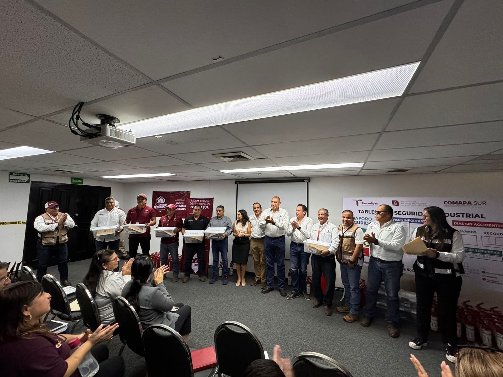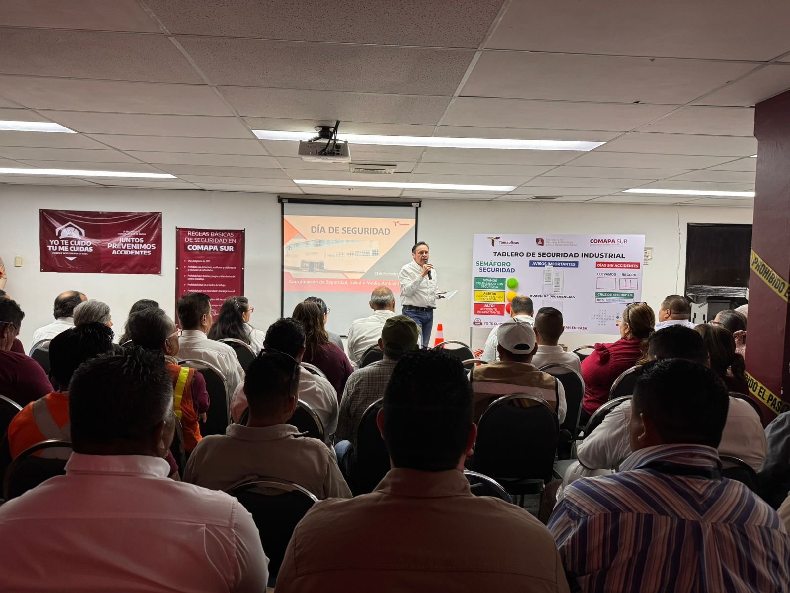 El arranque del evento se llevó a cabo en la Sala de Capacitación del organismo, en donde se contó con la presencia del gerente administrativo, Lic. Sergio Villarreal Brictson, quien asistió con la representación del gerente general, Mtro. Francisco José González Casanova; asimismo, estuvieron presentes, la Lic. Leticia Solís Ramírez, gerente de planeación estratégica; el Ing. Gilberto Olivo Quintero, gerente técnico; el Ing. Fernando Rodríguez Almaguer, gerente comercial, la comisaria de COMAPA SUR, Lic. Araceli de Jesús Pineda González, en tanto que en representación del sindicato, se contó con la asistencia de Maclovio Aradillas.