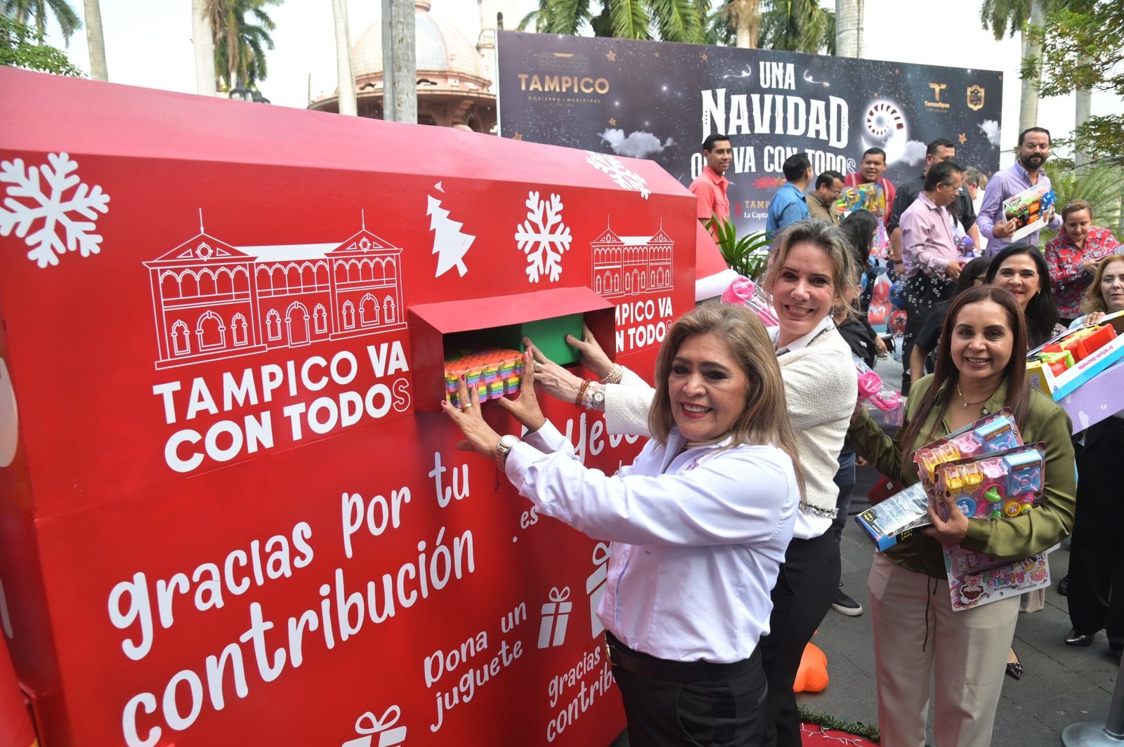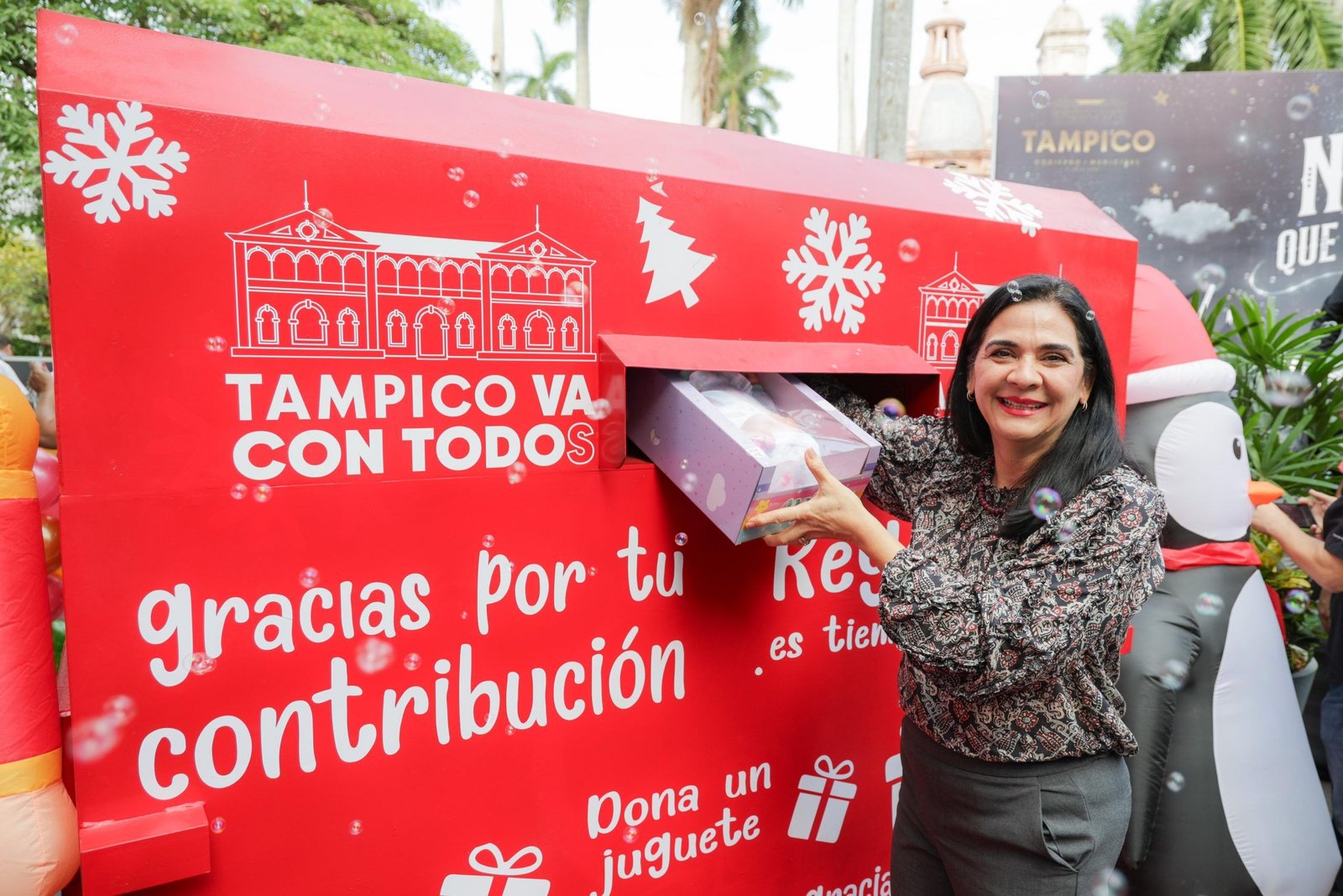Mónica Villarreal, acompañada también por los titulares de las dependencias organizadoras, Paola Del Sol Mejía y Luis Peraza Lacorte; y miembros del Cabildo subrayó que la campaña incluye la colocación de cuatro grandes contenedores especiales en sitios estratégicos, donde la ciudadanía podrá depositar los juguetes para entregar a los niños tampiqueños durante el festival de Día de Reyes.