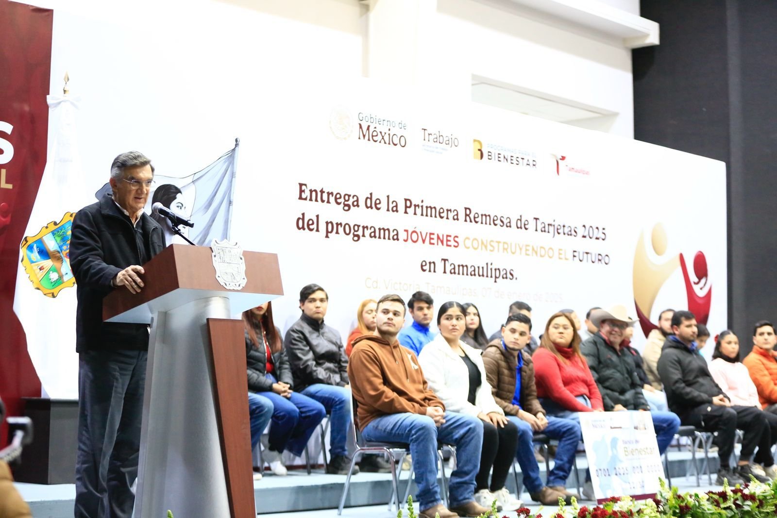 Ciudad Victoria, Tamaulipas.- El gobernador de Tamaulipas, Américo Villarreal Anaya, y el delegado de Bienestar Federal en la entidad, Luis Lauro Reyes Rodríguez, entregaron de manera simbólica la primera remesa de tarjetas 2025 del programa “Jóvenes Construyendo el Futuro”, donde reafirmaron el compromiso para apoyar a la juventud tamaulipeca.