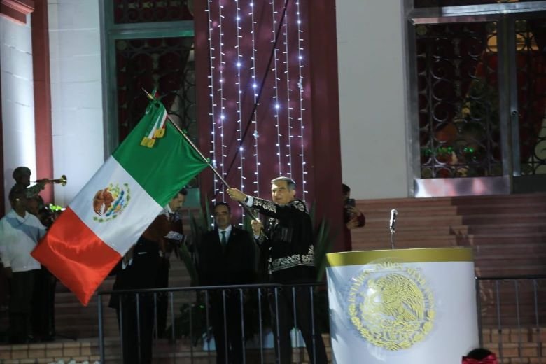 Desde la escalinata principal de Palacio de Gobierno, el gobernador de Tamaulipas recibió la bandera nacional de manos de la escolta del 77 Batallón de Infantería y exclamó.