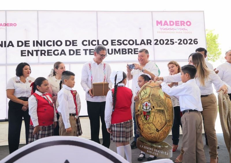 En el marco del inicio del ciclo escolar 2025-2026, el presidente municipal, Erasmo González Robledo, refrendó el compromiso de seguir impulsando la educación y el desarrollo de las alumnas y los alumnos que este lunes regresaron a clases en Ciudad Madero, durante una ceremonia efectuada en la Escuela Primaria “Sección Uno Petroleros” en la colonia Candelario Garza, donde además entregó una techumbre para beneficio de los cerca de 500 estudiantes que asisten a ese plantel en los turnos matutino y vespertino.