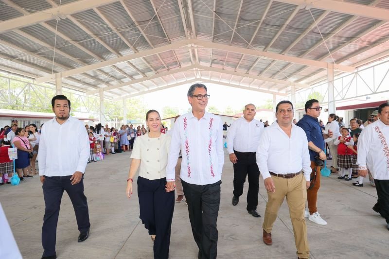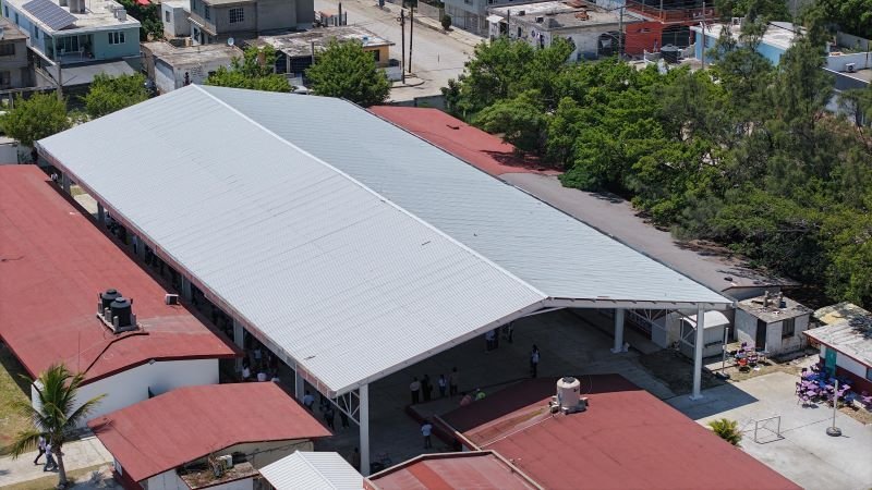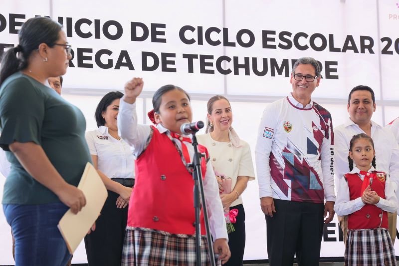 “Venimos a inaugurar esta monumental techumbre, porque está grande, y quedó para que niñas y niños puedan disfrutar de sus actividades deportivas y culturales, además para que puedan salir al receso y no les pegue tanto el sol, para que las mamás y los papás estén tranquilos”, expresó González Robledo.