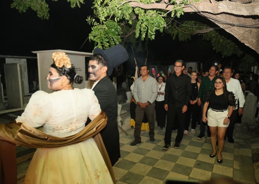 Ahí en el panteón de Árbol Grande se escenificó una obra teatral, donde también estuvieron presentes síndicos y regidores, que se unen a esta Luz y Tradición, que congrega a cientos de familias durante estos días para visitar a sus deudos. Las celebraciones continuarán este domingo a partir de las 17:00 horas en el parque Bicentenario, muestra de altares, grupos de danza, el concierto “El son del Catrín”, participación de calaveritas literarias.