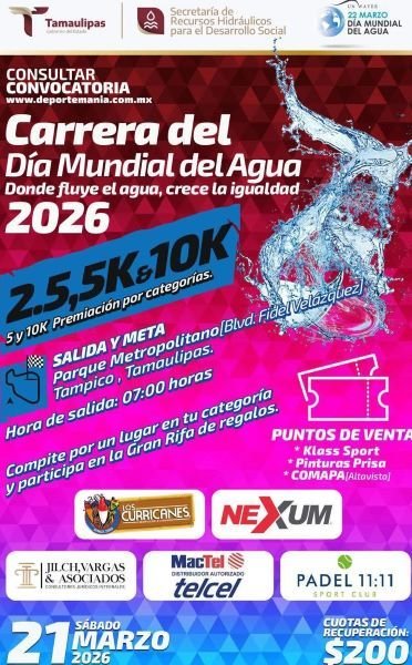 En el marco del Día Mundial del Agua, la Secretaría de Recursos Hidráulicos para el Desarrollo Social invita a la ciudadanía a participar en la Carrera por el Agua 2026, que se llevará a cabo el próximo 21 de marzo en el Parque Metropolitano de Tampico, como parte de las actividades orientadas a fomentar la conciencia sobre el cuidado y la valoración de este recurso vital.