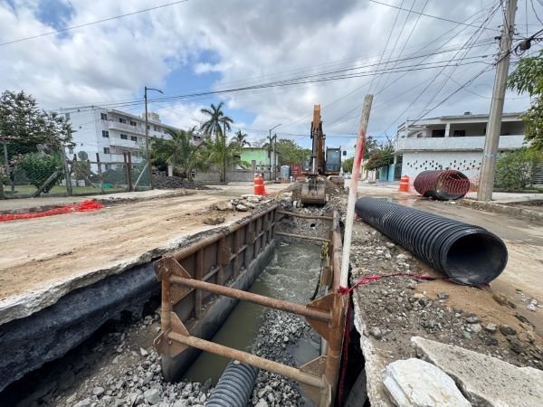 Actualmente se lleva a cabo la reposición de un colector sanitario de 24 pulgadas, con una extensión de 150 metros lineales, ubicado en la calle 5 entre H y Cárcamo 2 Norte, en la colonia Enrique Cárdenas González, al norte de la ciudad.
